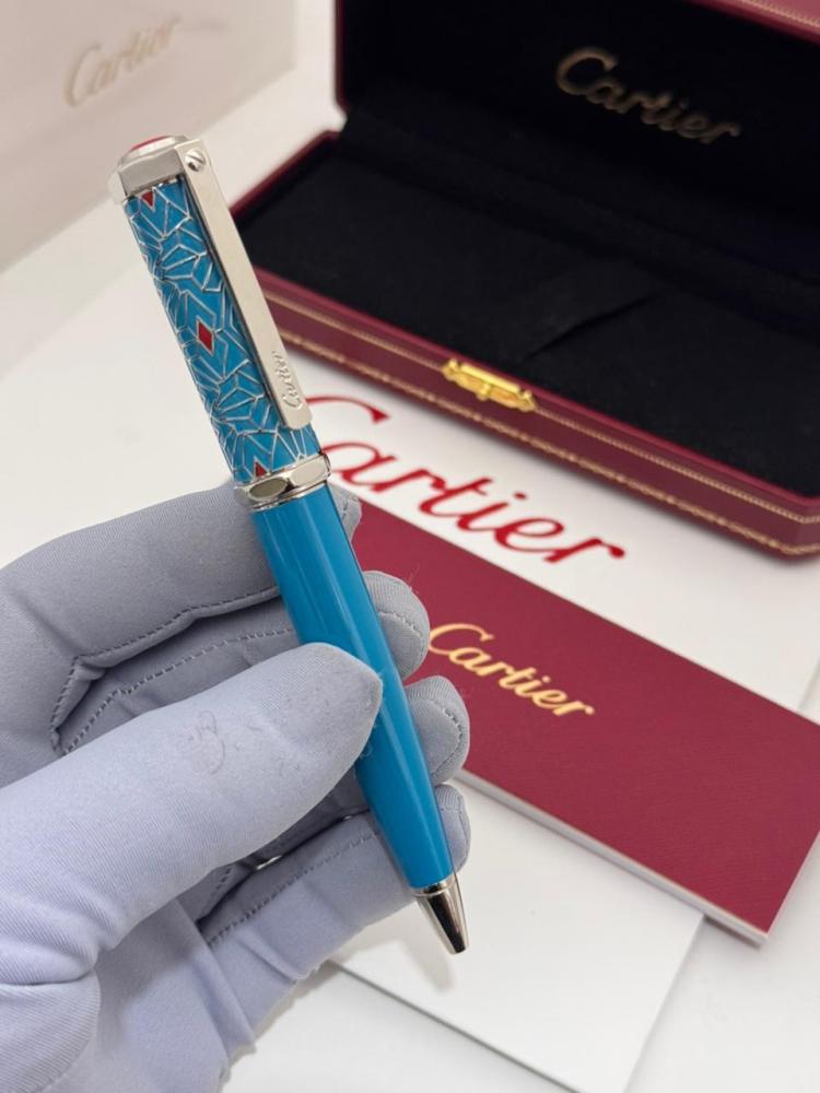 قلم استثنائي من Cartier يتميز بجسم أزرق فاتح لامع يمنح إحساساً بالحيوية والتجدد، وغطاء فضي مزين بزخارف هندسية فنية بالأحمر والأبيض تضيف له لمسة عصرية مبتكرة. المشبك يحمل توقيع Cartier بحرفية عالية، بينما يزين أعلى الغطاء حجر كابوشون أحمر كلاسيكي يرمز لفخامة هذه العلامة العريقة.