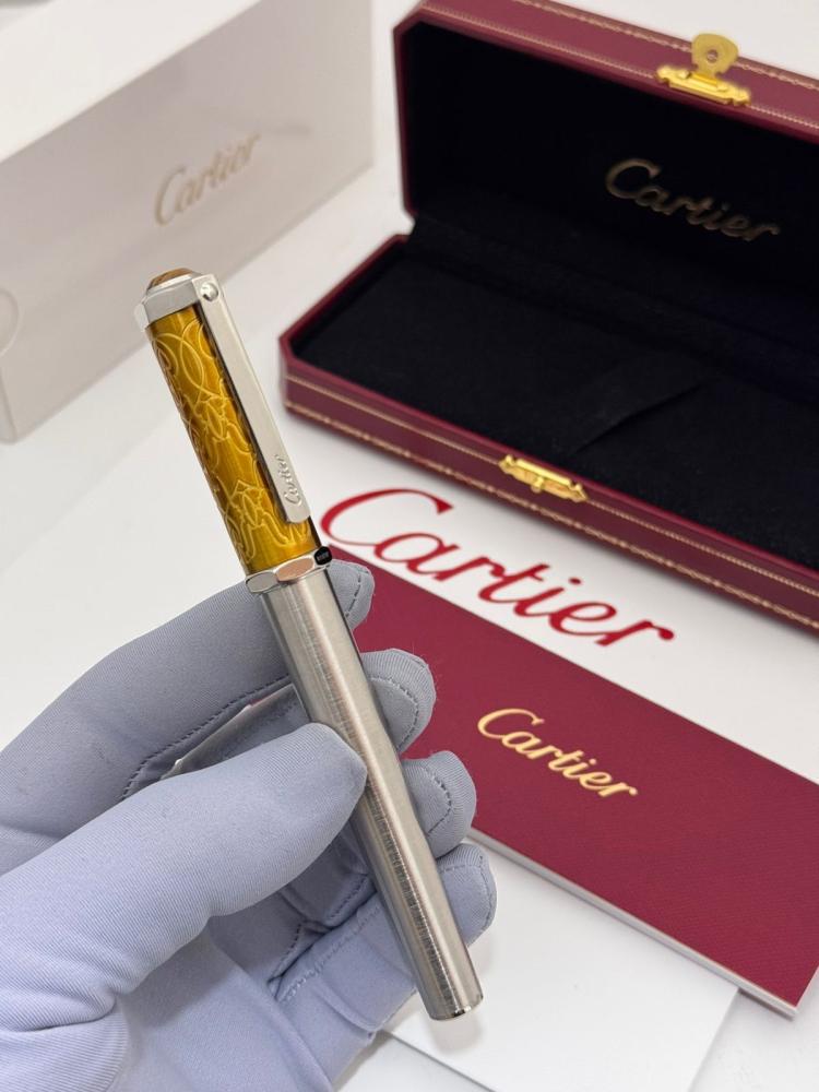 الغطاء: تصميم فاخر مطلي بالمينا بلون أصفر ذهبي غني، ومزين بنقوش شعار كارتييه "Double C" المنقوشة بدقة.