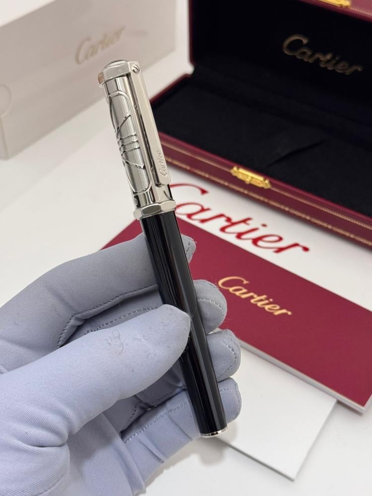 قلم فاخر من مجموعة Diabolo de Cartier يتميز بجسم أسود لامع أنيق، وغطاء فضي محفور بتصميم هندسي فني يعكس الإبداع والاحتراف. المشبك الجانبي يحمل توقيع Cartier، ويعلو الغطاء حجر كابوشون شفاف يمنح القلم طابعاً ملكياً فاخراً. مثالي لعشاق التميز والرقي في تفاصيل الكتابة.
